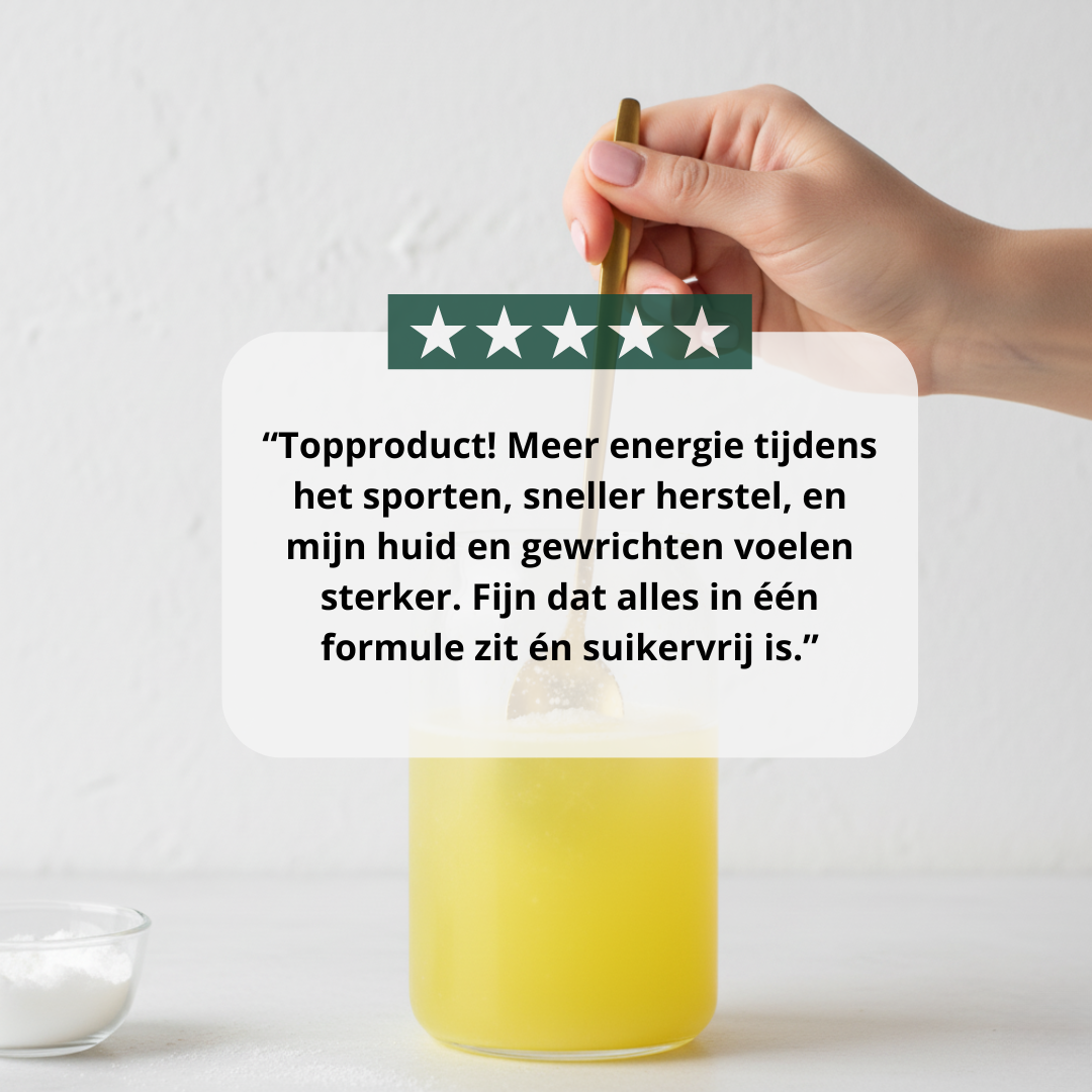 Deze unieke combinatie ondersteunt je energie, herstel, hydratatie en huid — allemaal met één scoop per dag.